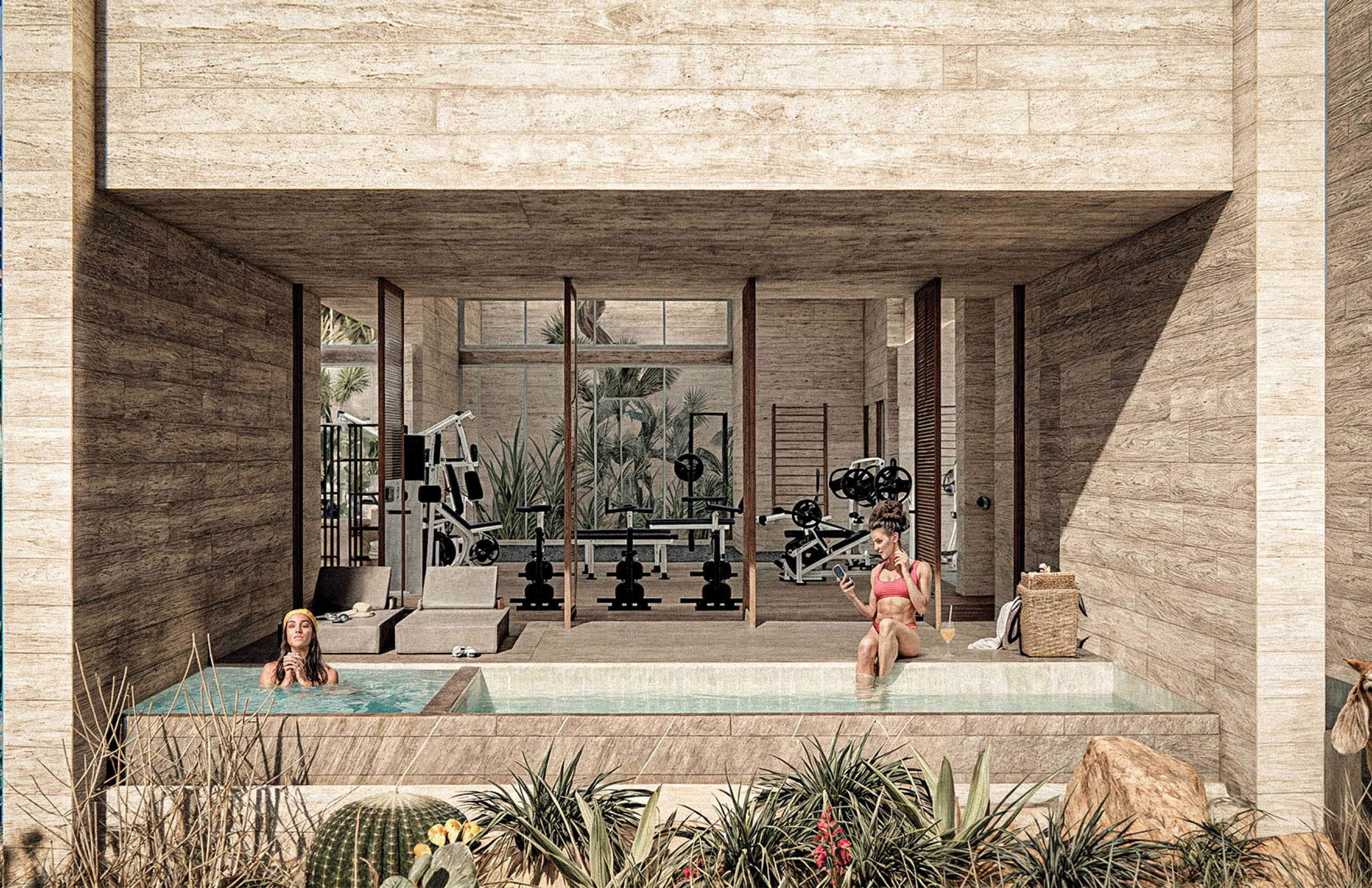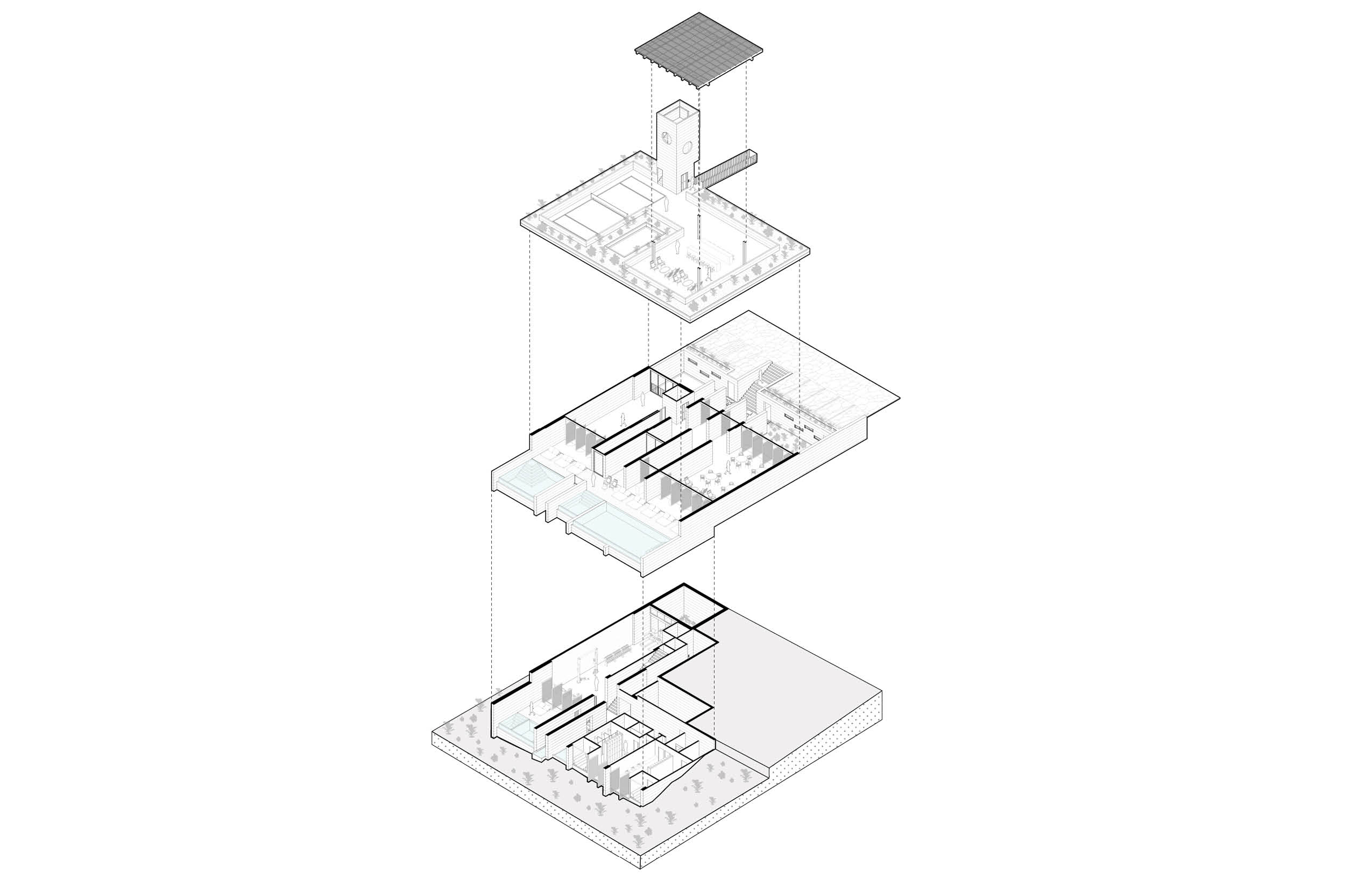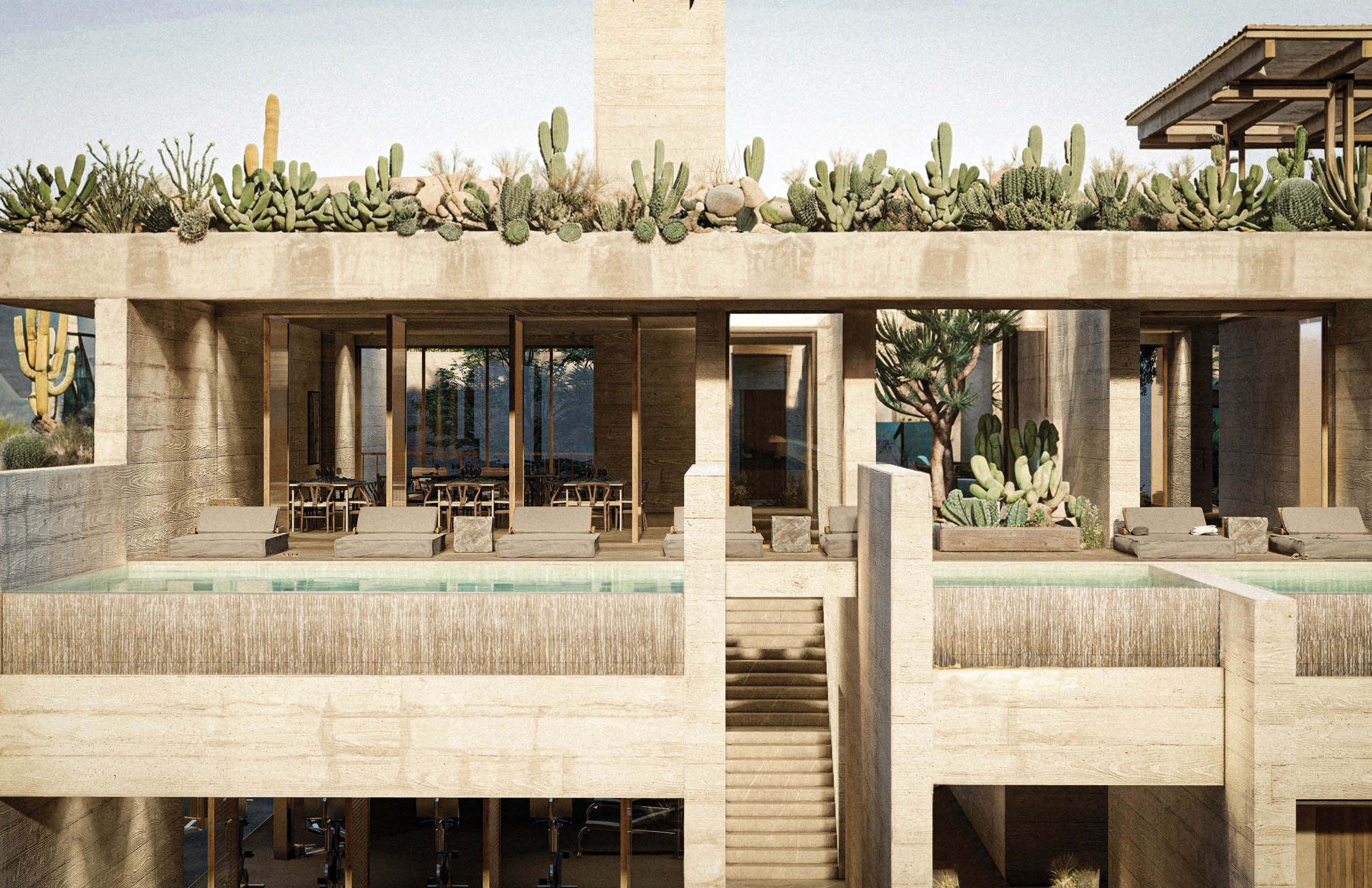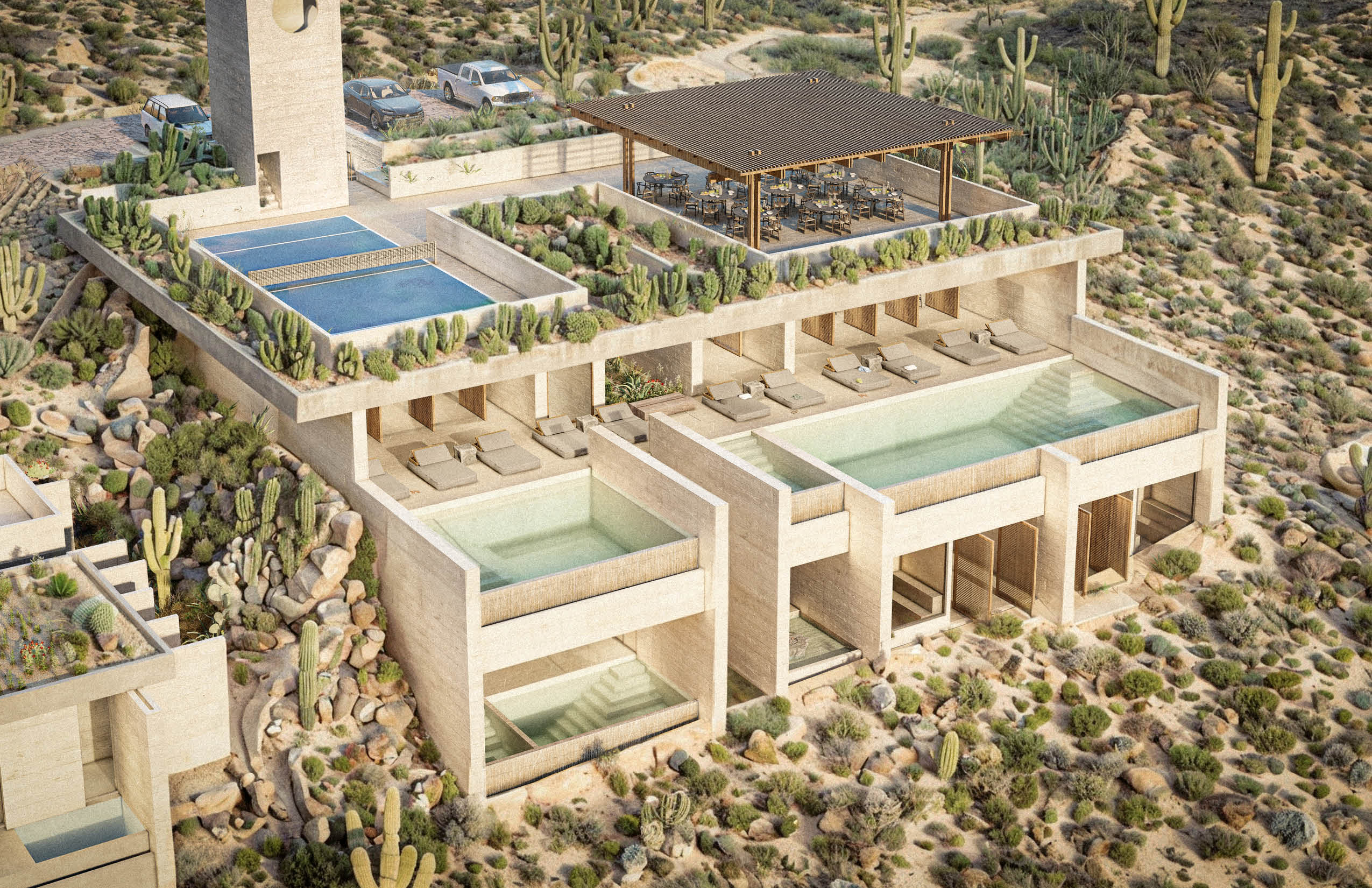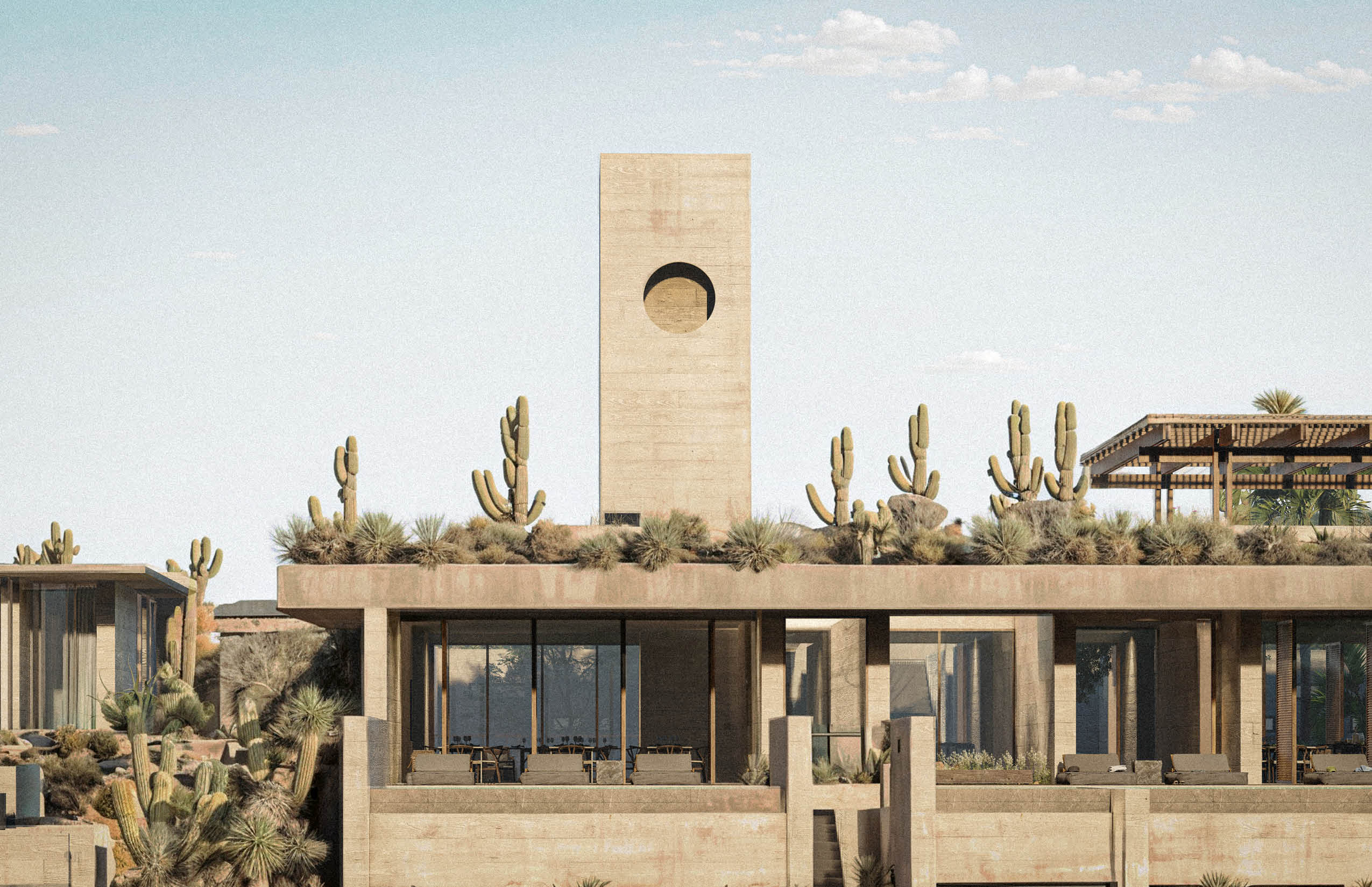 El programa integra un restaurante, un salón de usos múltiples, gimnasio y alberca, ofreciendo espacios compartidos para el encuentro, la recreación y la vida cotidiana. El acceso principal se realiza por la azotea del edificio, a través de una torre de circulación vertical que, además, funciona como mirador. Esta secuencia de llegada elevada enmarca vistas hacia el desarrollo y el horizonte circundante. La azotea se concibe también como un mirador y puede utilizarse como cancha de pickleball, ampliando las posibilidades recreativas del conjunto. El edificio es completamente abierto, favoreciendo la ventilación cruzada y la iluminación natural mediante patios que permiten que los espacios interiores se mantengan fluidos, sombreados y ambientalmente eficientes.