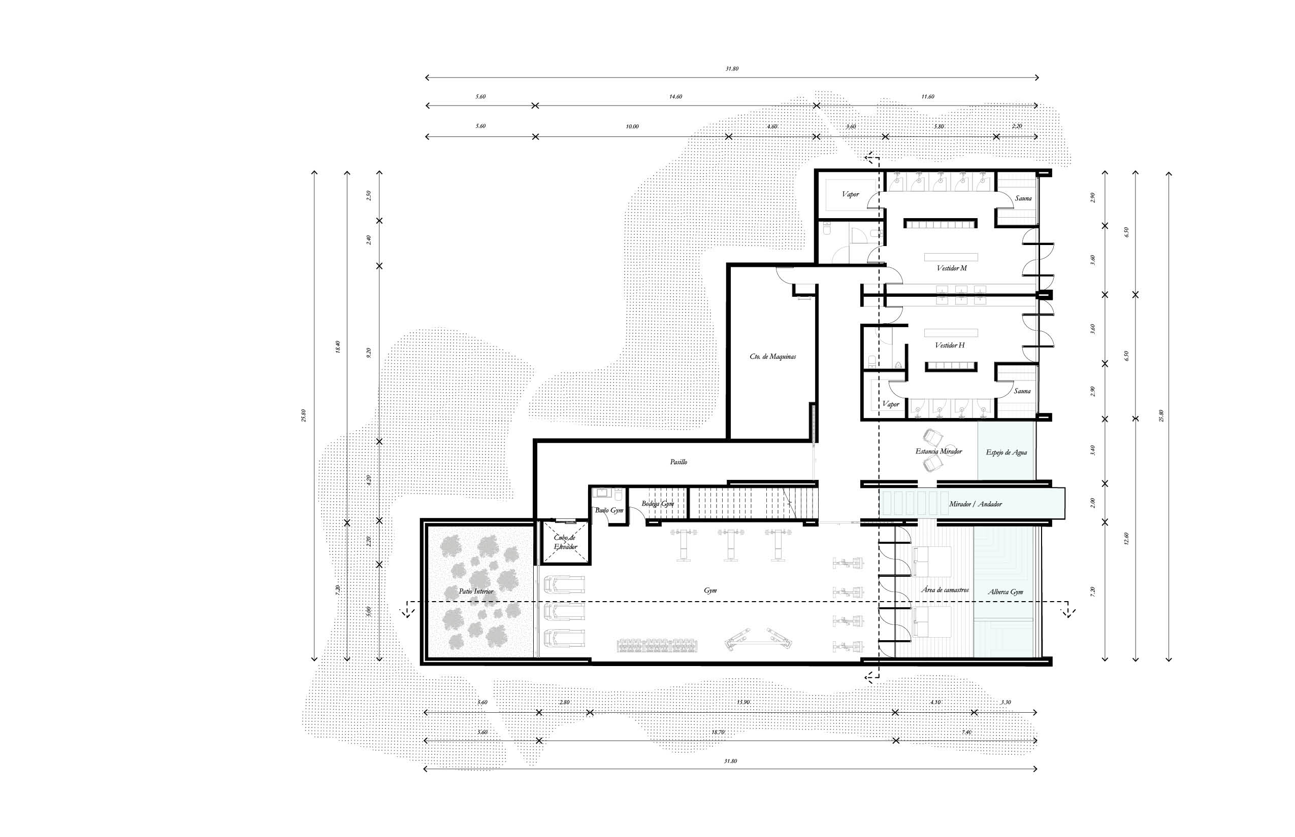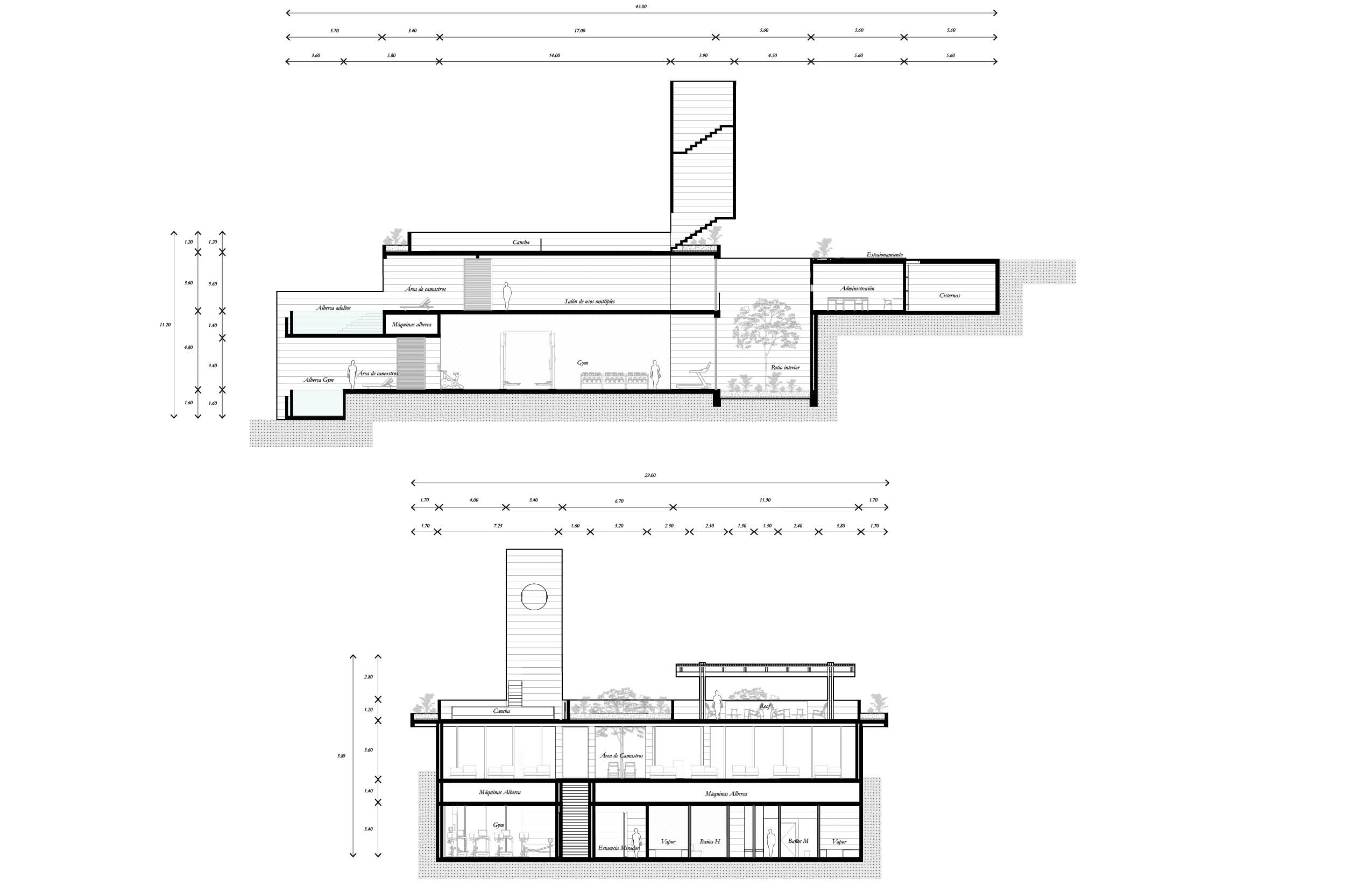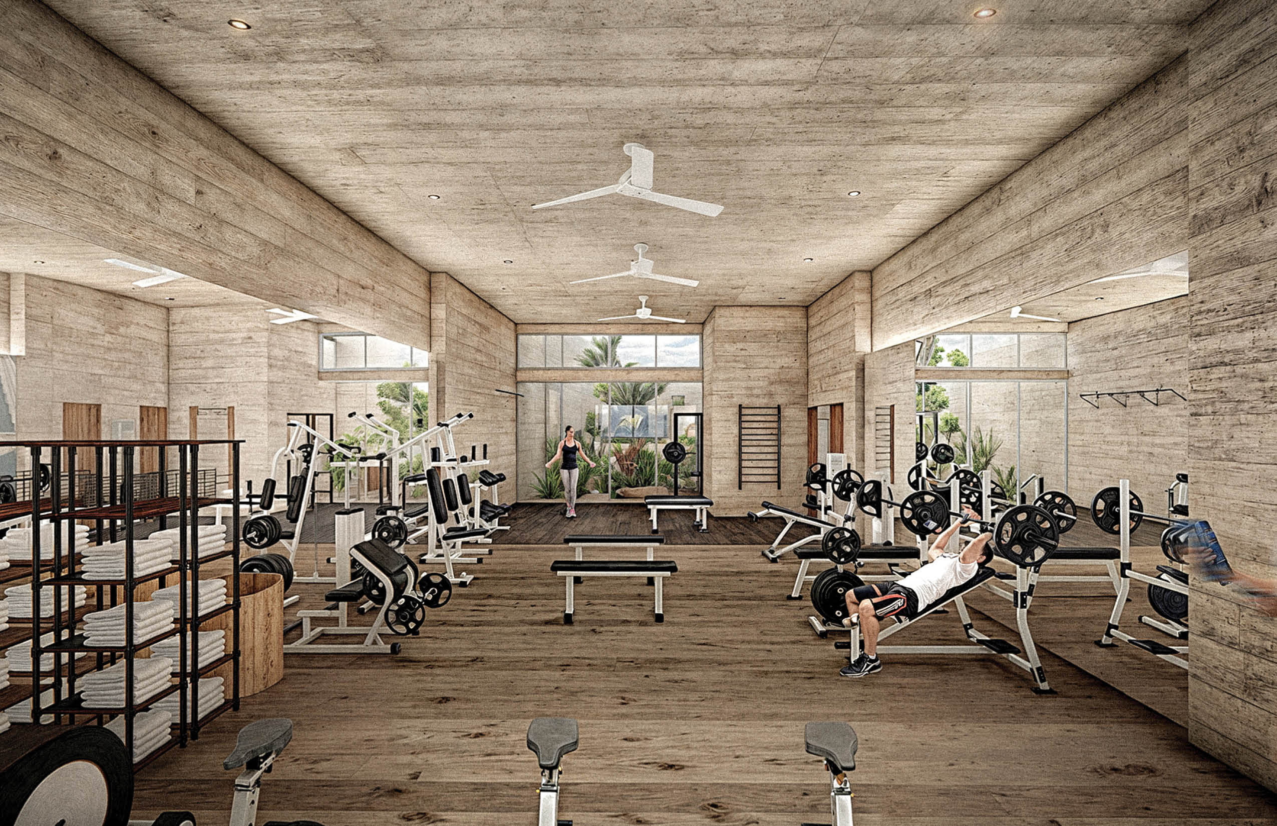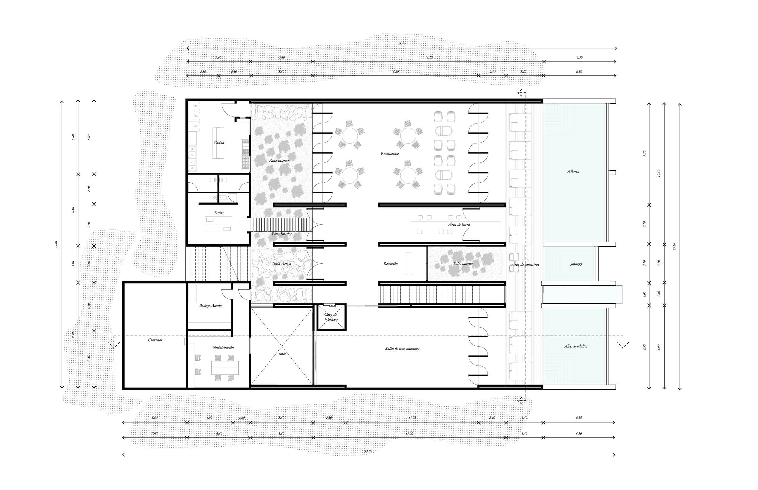 El programa integra un restaurante, un salón de usos múltiples, gimnasio y alberca, ofreciendo espacios compartidos para el encuentro, la recreación y la vida cotidiana. El acceso principal se realiza por la azotea del edificio, a través de una torre de circulación vertical que, además, funciona como mirador. Esta secuencia de llegada elevada enmarca vistas hacia el desarrollo y el horizonte circundante. La azotea se concibe también como un mirador y puede utilizarse como cancha de pickleball, ampliando las posibilidades recreativas del conjunto. El edificio es completamente abierto, favoreciendo la ventilación cruzada y la iluminación natural mediante patios que permiten que los espacios interiores se mantengan fluidos, sombreados y ambientalmente eficientes.