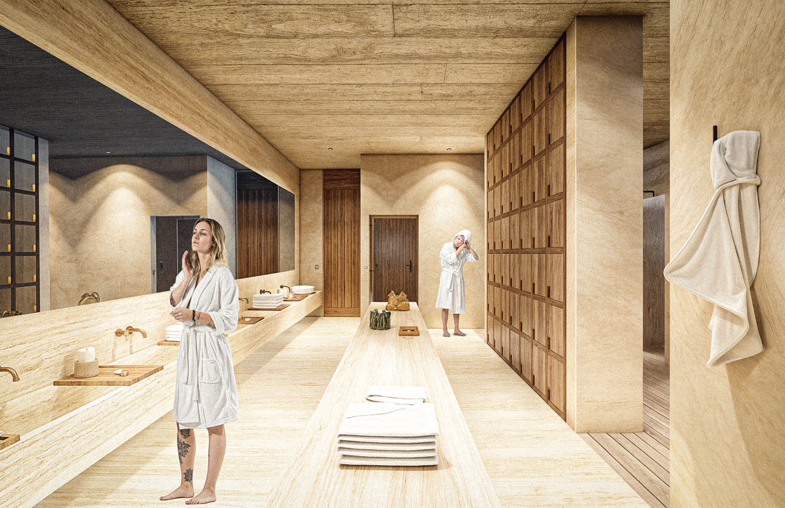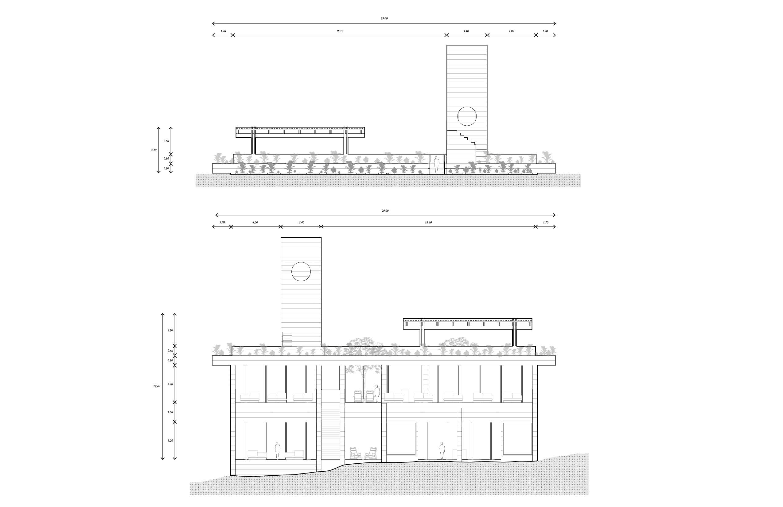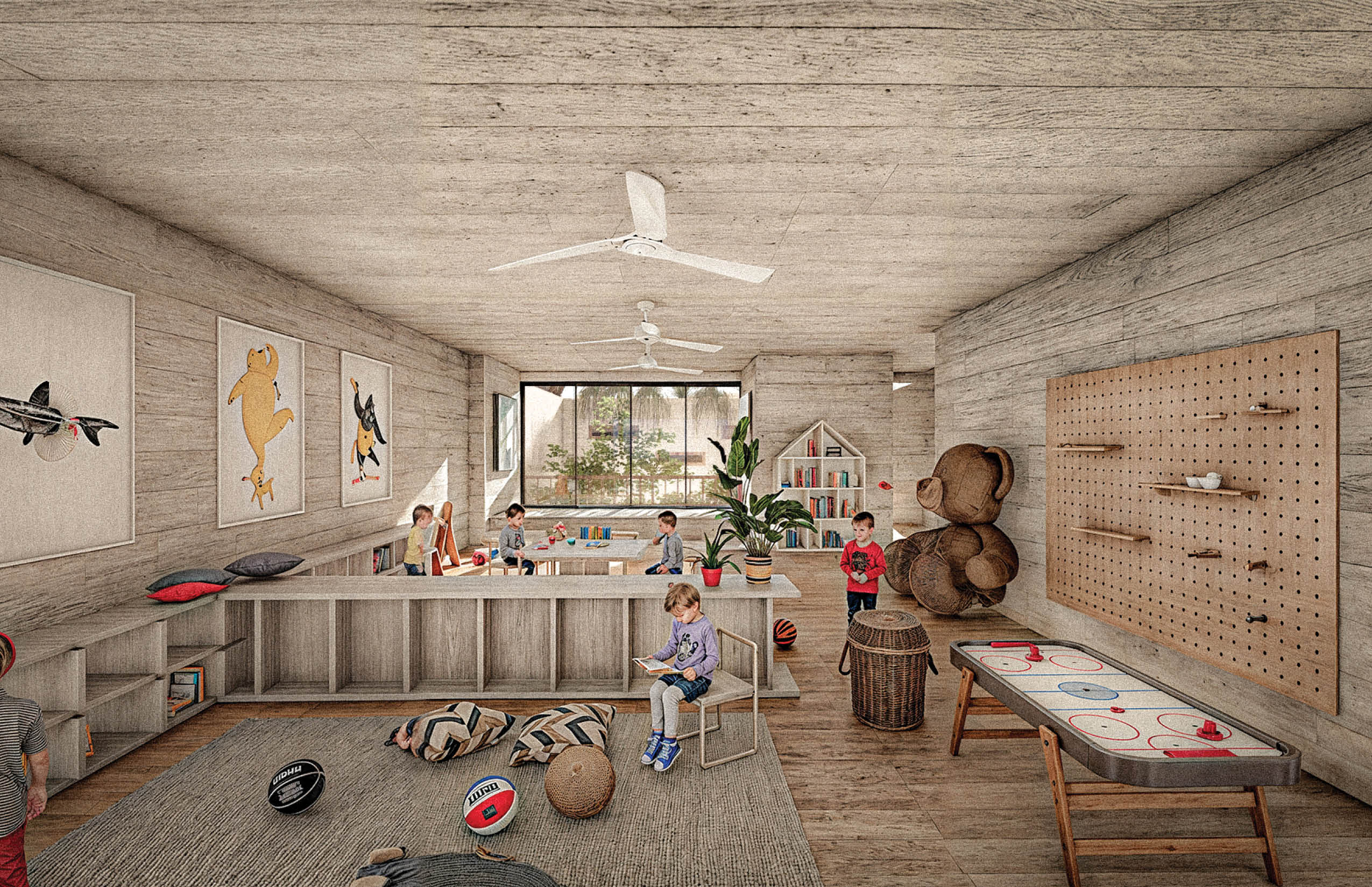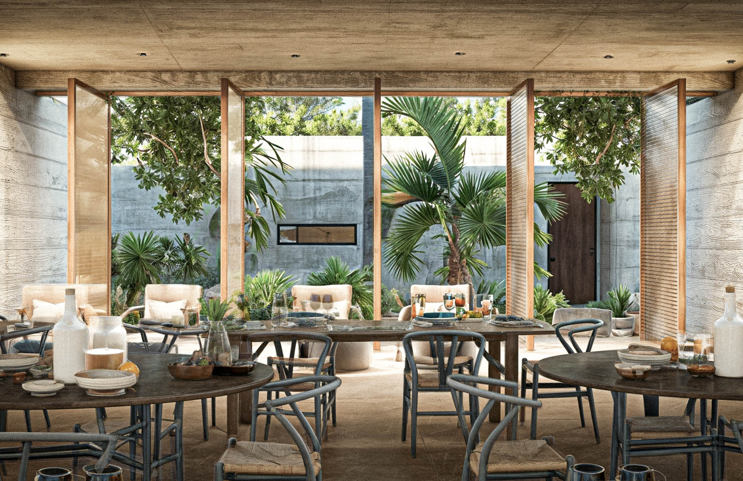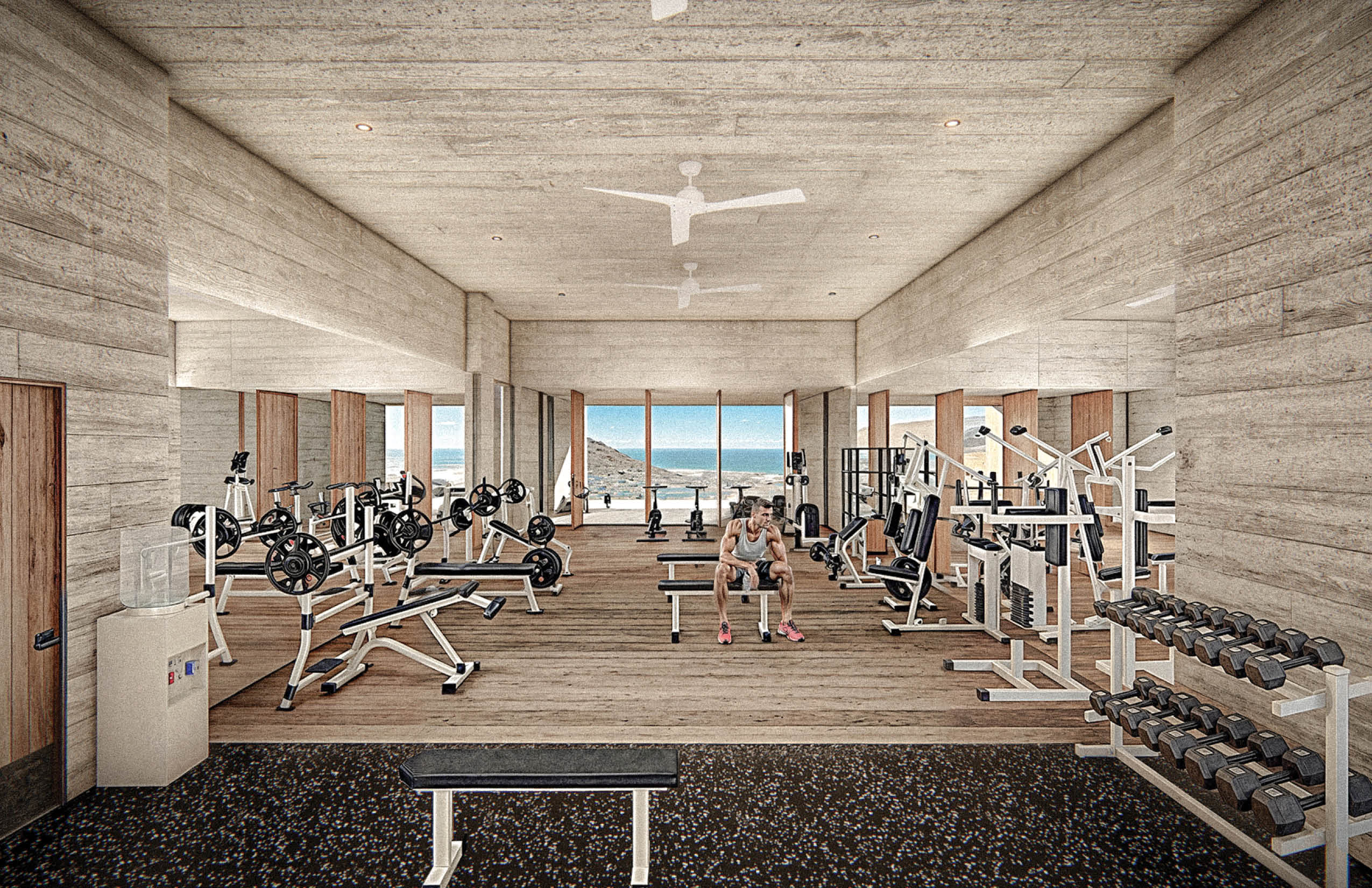 El programa integra un restaurante, un salón de usos múltiples, gimnasio y alberca, ofreciendo espacios compartidos para el encuentro, la recreación y la vida cotidiana. El acceso principal se realiza por la azotea del edificio, a través de una torre de circulación vertical que, además, funciona como mirador. Esta secuencia de llegada elevada enmarca vistas hacia el desarrollo y el horizonte circundante. La azotea se concibe también como un mirador y puede utilizarse como cancha de pickleball, ampliando las posibilidades recreativas del conjunto. El edificio es completamente abierto, favoreciendo la ventilación cruzada y la iluminación natural mediante patios que permiten que los espacios interiores se mantengan fluidos, sombreados y ambientalmente eficientes.