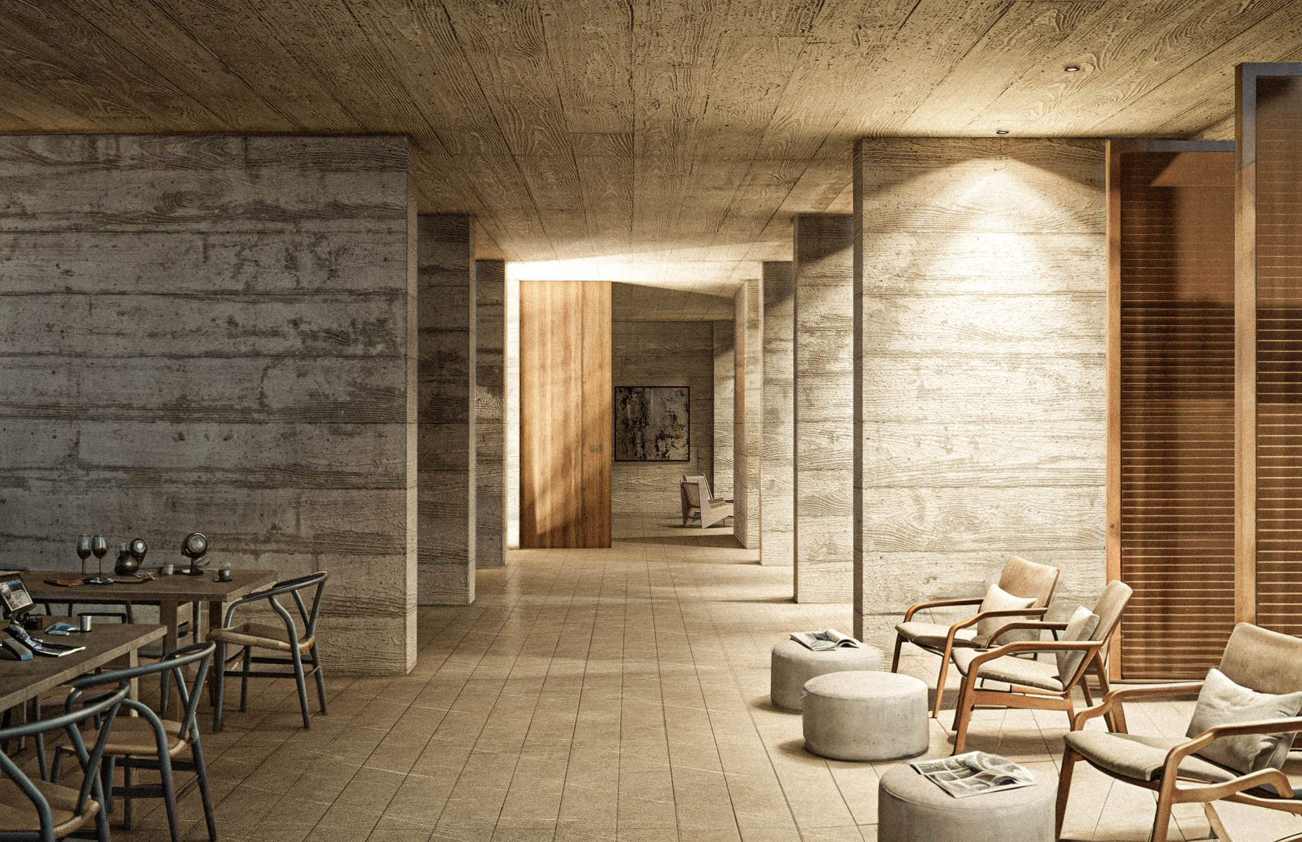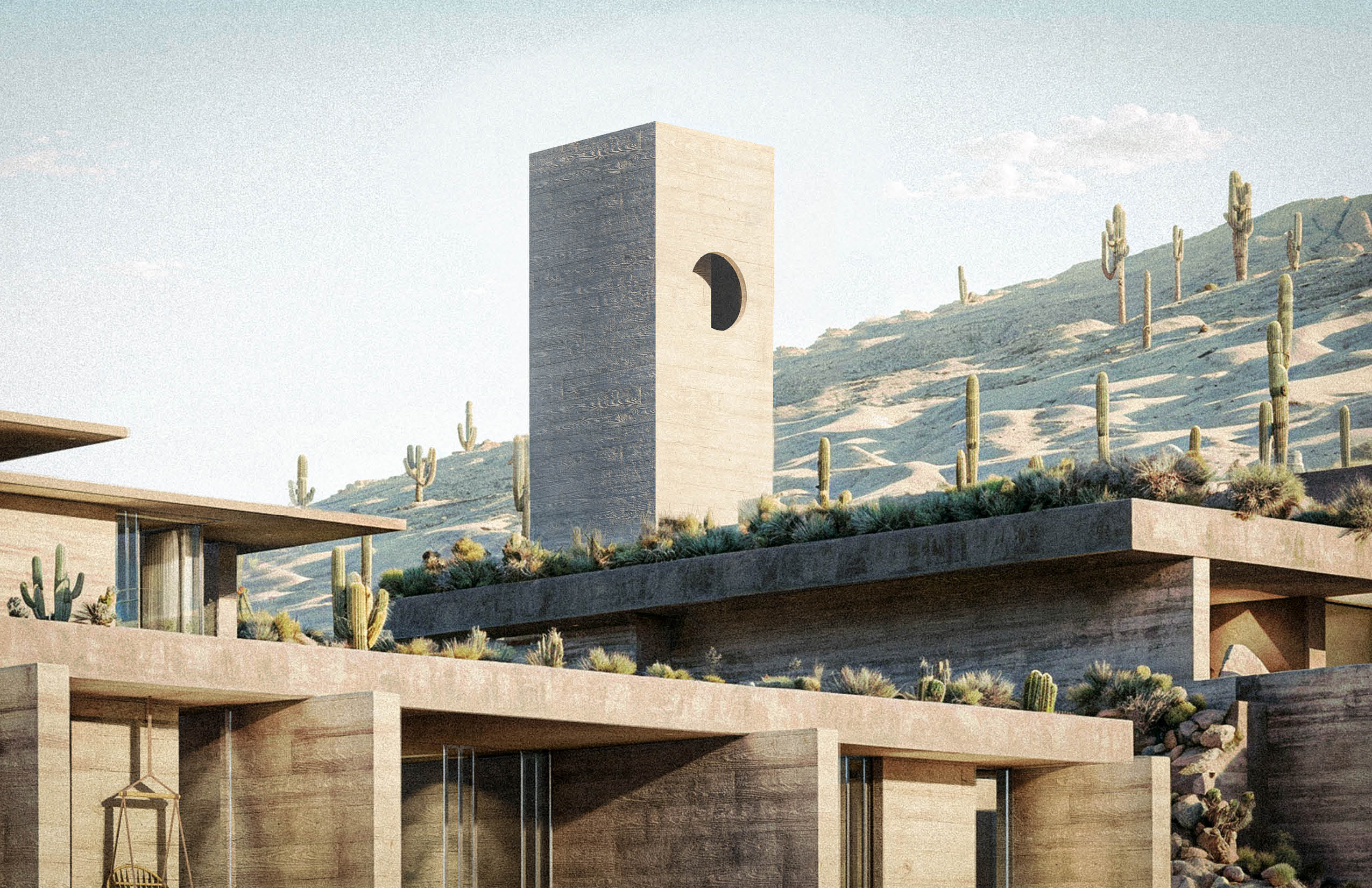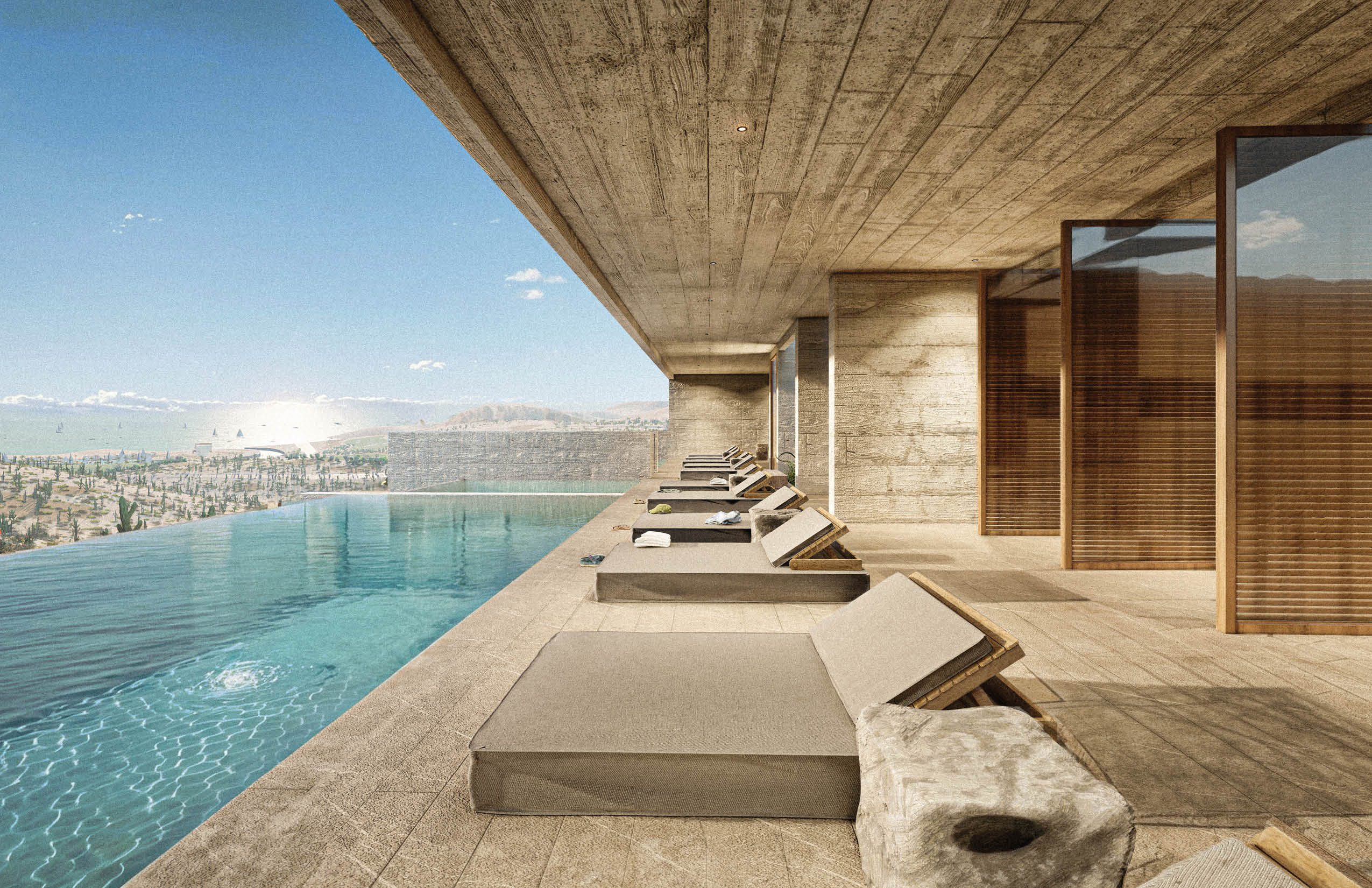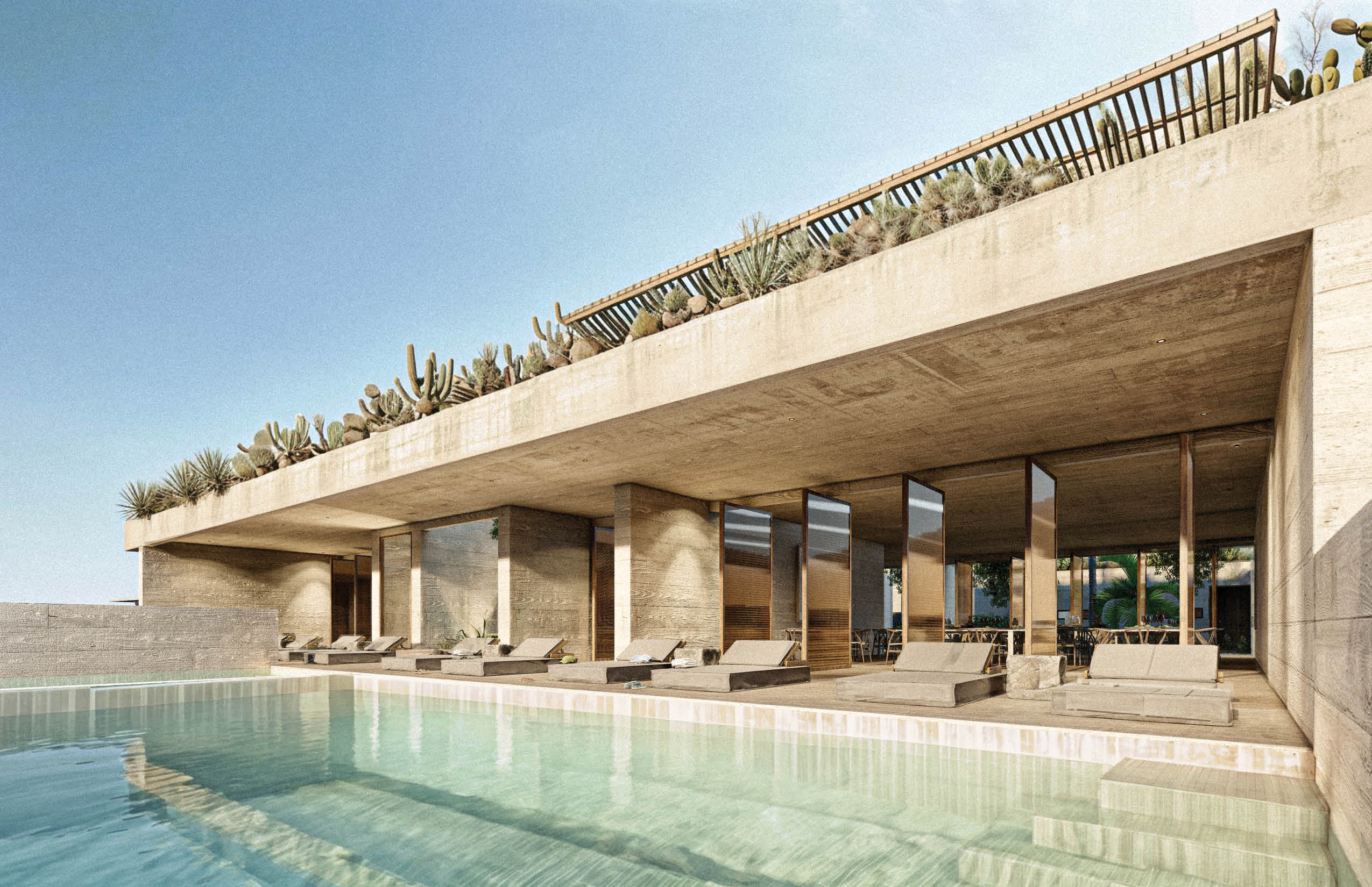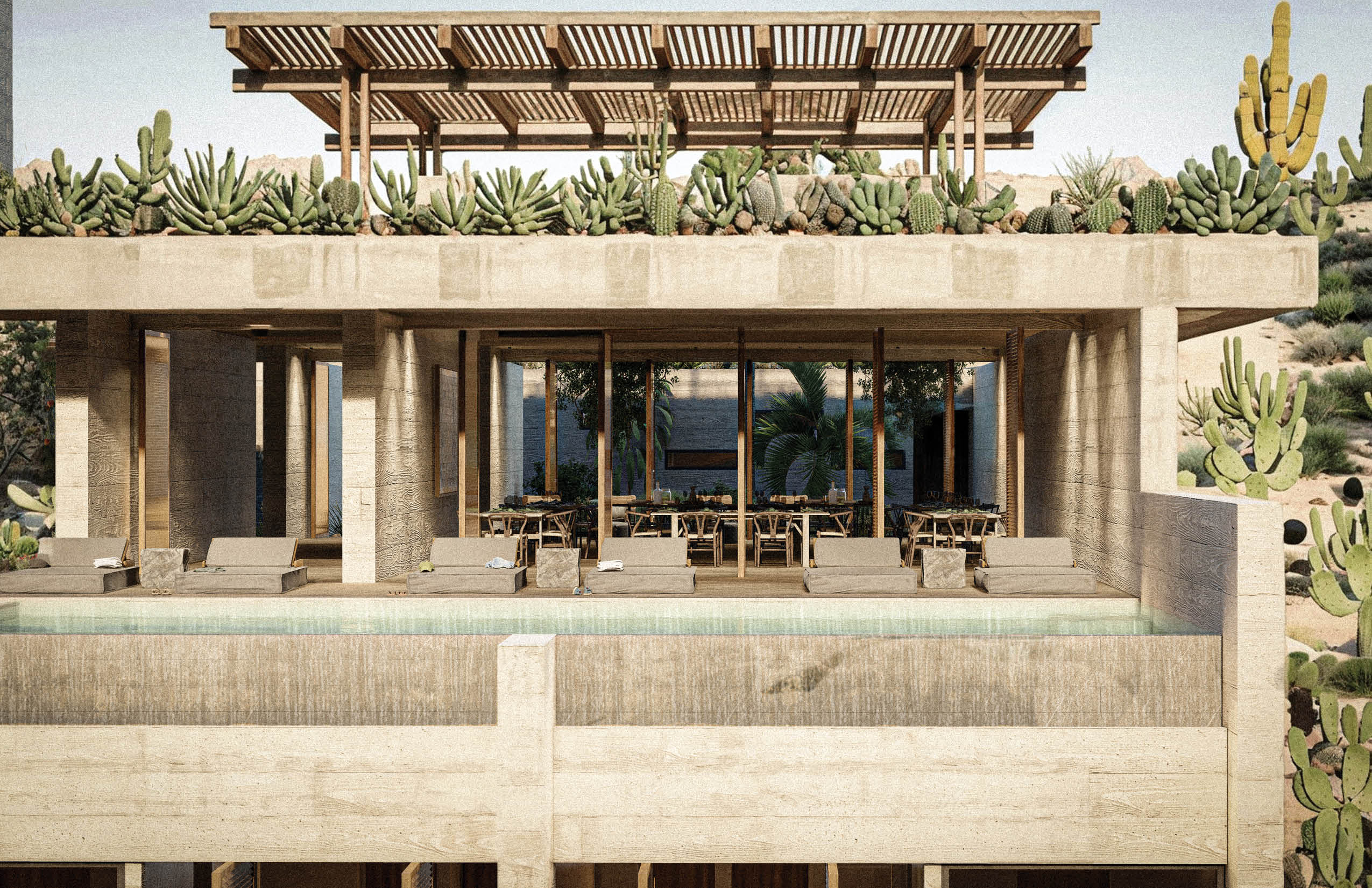 "La Cañada - Casa Club" serves as the communal heart of the residential development in La Paz, Baja California, Mexico. Located at the far end of the site, the building is conceived as a quiet and grounded presence that supports the 27 homes and residential tower, without competing with them. Constructed in pigmented concrete that matches the earthy tones of the terrain, the architecture seeks to blend into its surroundings, reducing its visual impact and establishing a subtle dialogue with the landscape. Its materiality reinforces a sense of permanence and continuity with the site.