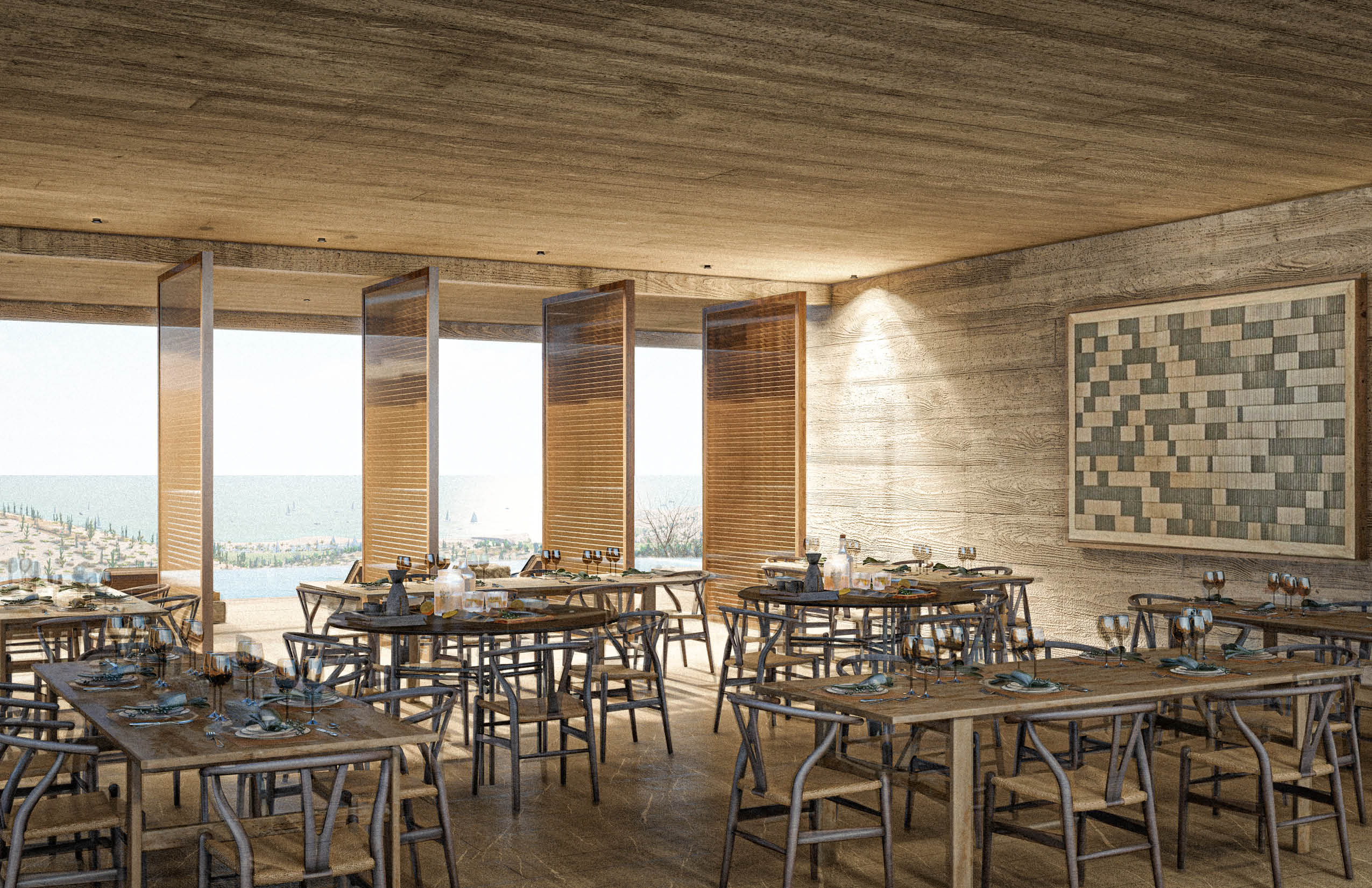 The program includes a restaurant, a multipurpose hall, a gym, and a swimming pool, offering shared spaces for gathering, recreation, and everyday life. Access to the building occurs from the rooftop, reached through a vertical circulation tower that also functions as a lookout point. This elevated arrival sequence frames views of the development and the surrounding horizon. The rooftop itself acts as an observatory and can also be used as a pickleball court, expanding the building’s recreational capacity. Conceived as a fully open structure, the club promotes cross ventilation and natural lighting through a series of patios, allowing interior spaces to remain fluid, shaded, and environmentally responsive.