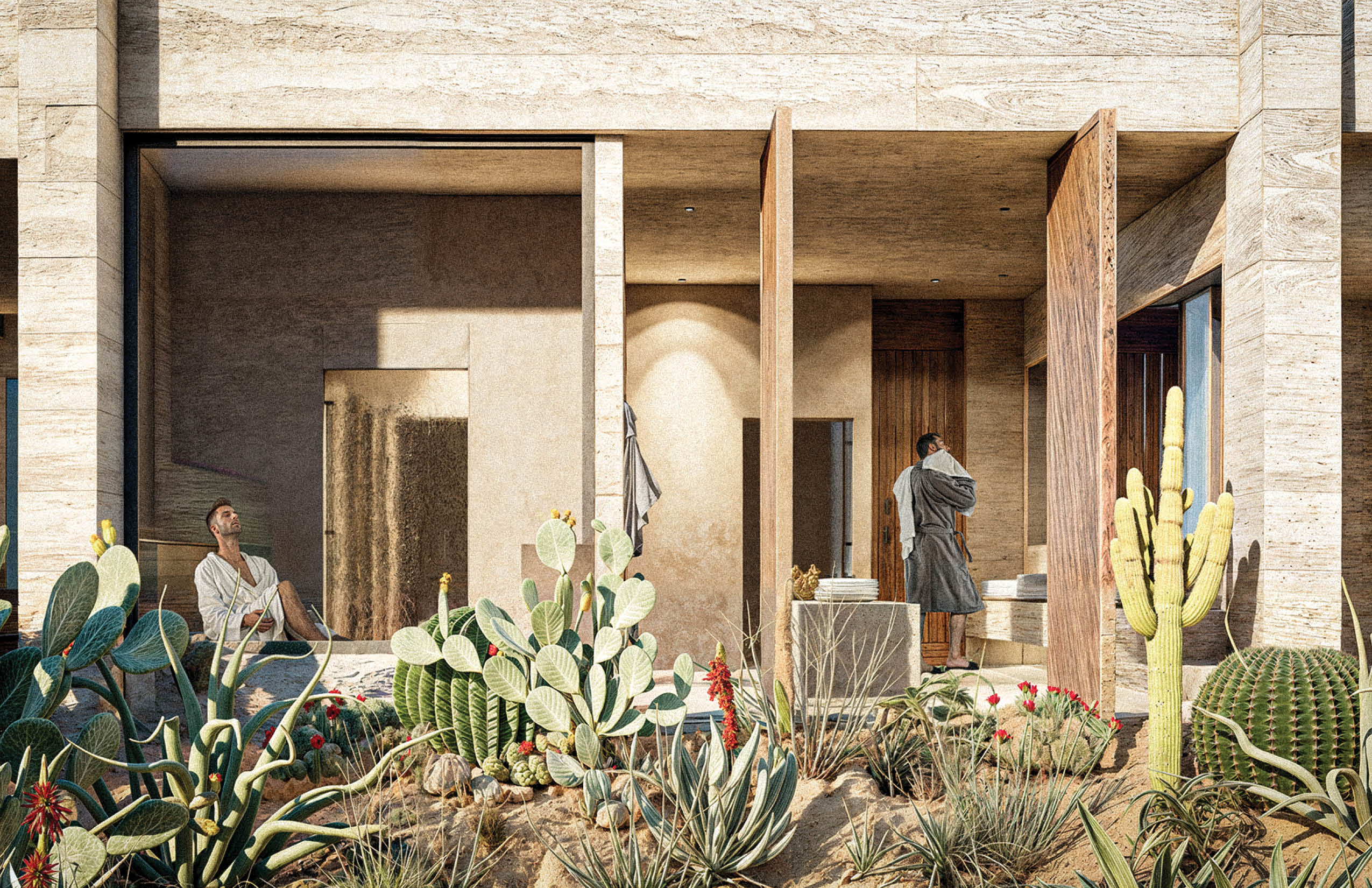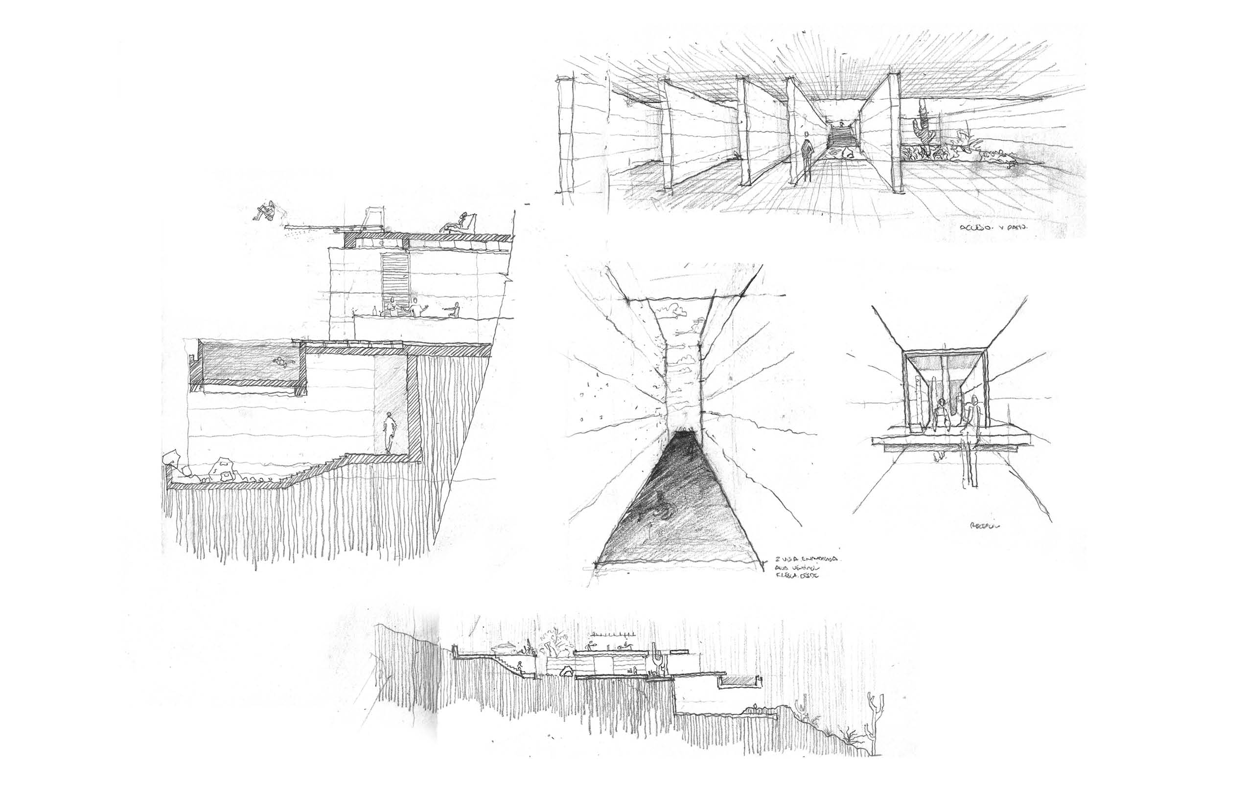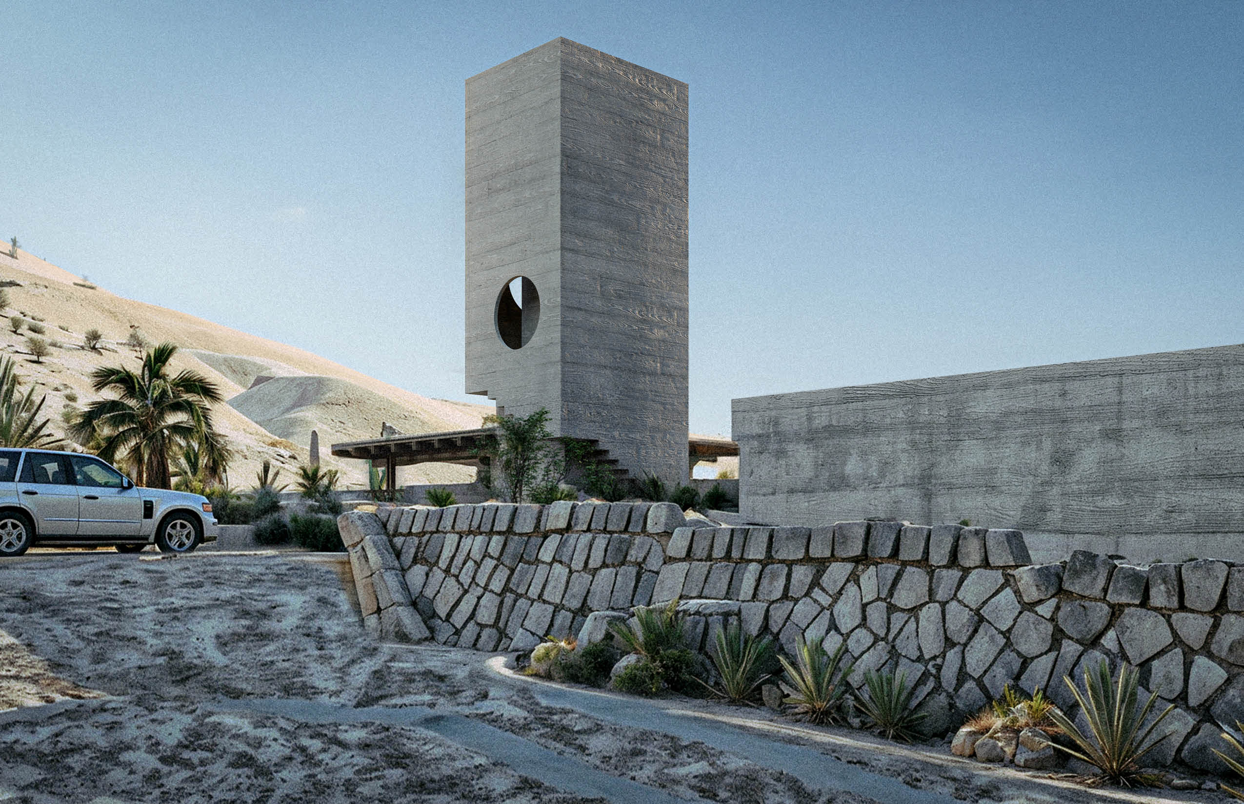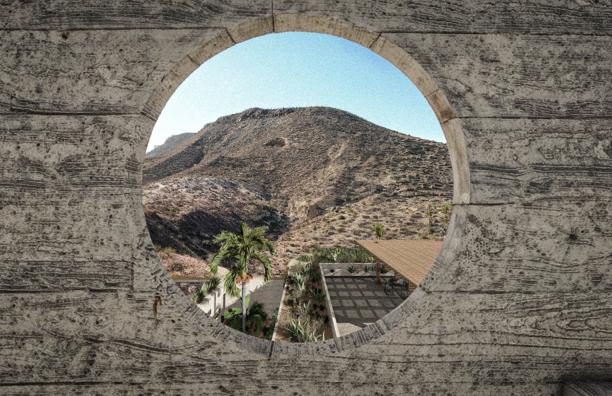 "La Cañada - Casa Club" funciona como el corazón comunitario del desarrollo residencial en La Paz, Baja California, México. Ubicada al fondo del conjunto, la edificación se concibe como una presencia discreta y arraigada al sitio, pensada para dar servicio a las 27 viviendas y a la torre residencial sin competir con ellas. Construida en concreto pigmentado del color de la tierra del lugar, la arquitectura busca mimetizarse con el entorno, disminuyendo su impacto visual y estableciendo un diálogo sutil con el paisaje. Su materialidad refuerza una sensación de permanencia y continuidad con el terreno.